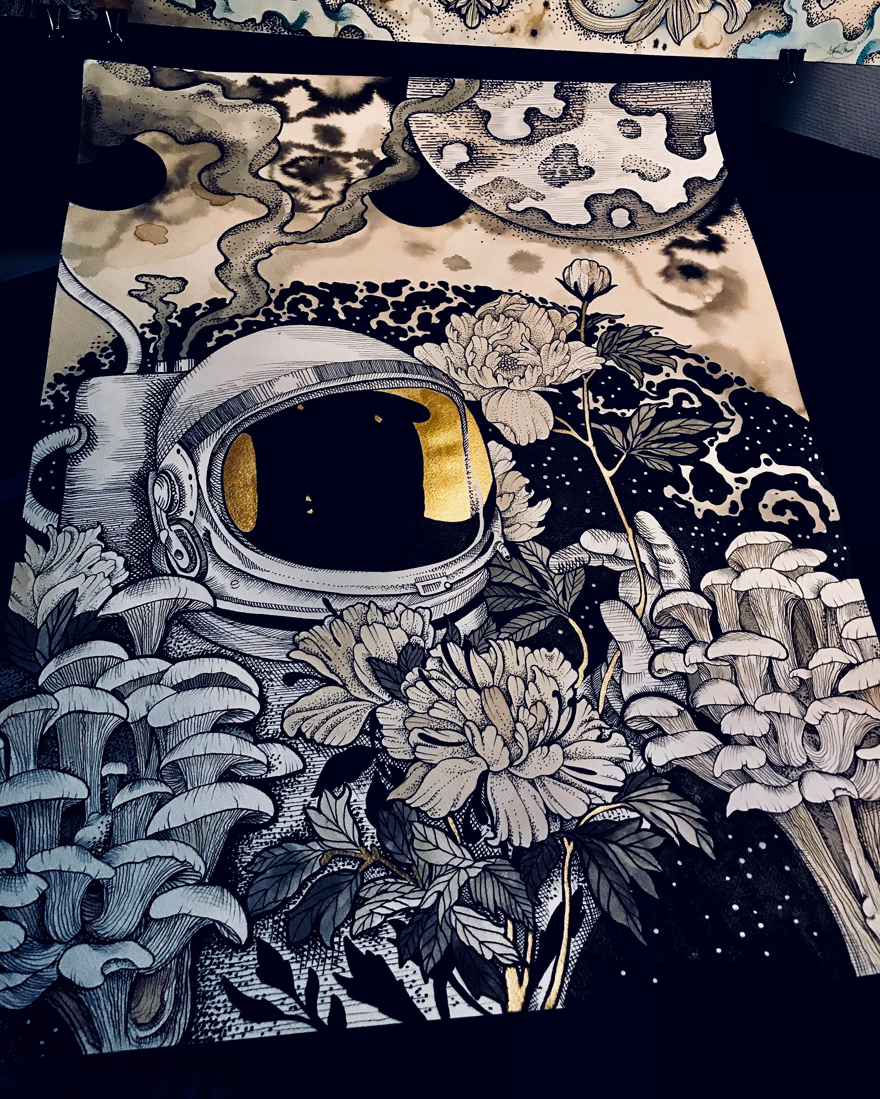 Ink, coffe and gold on paper